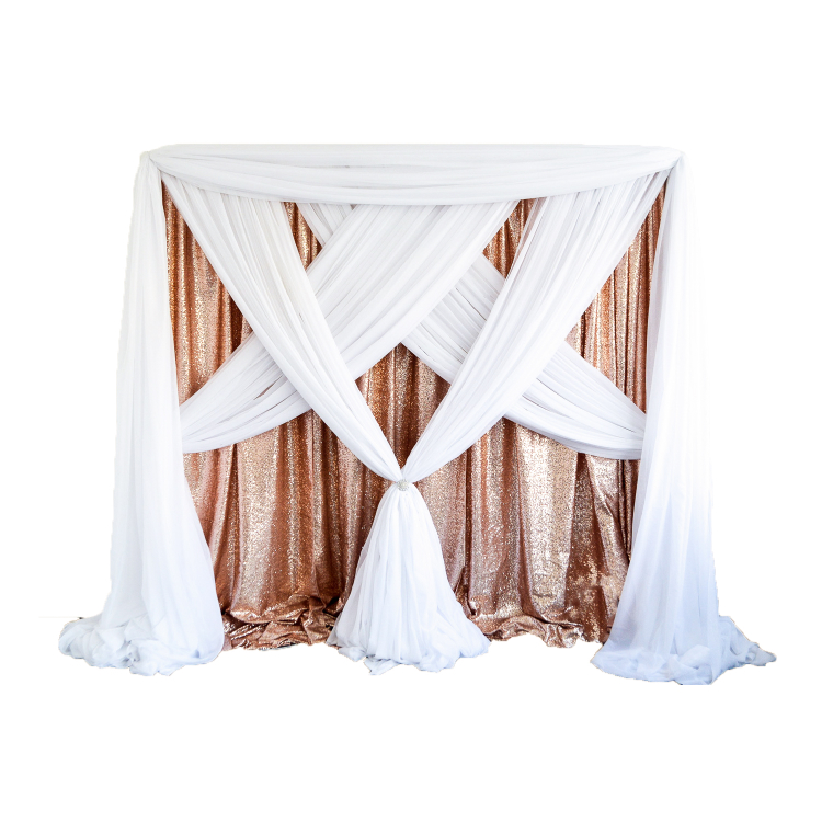 A standard backdrop (approx. 30' wide) includes: solid back panel, shear front panels, accent pan, crystals or chandelier, and uplighting. Contact Chairflair for color options.