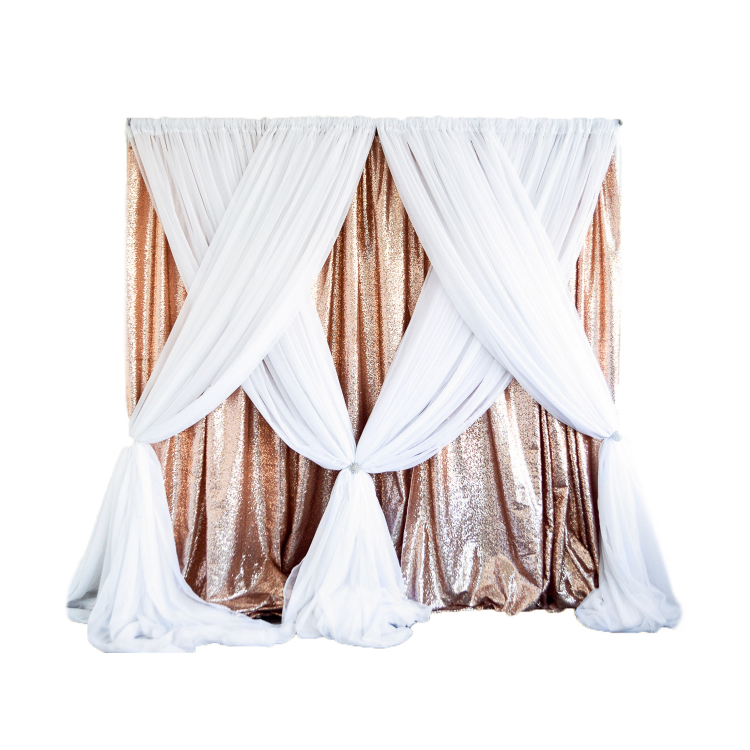 A standard backdrop (approx. 30' wide) includes: solid back panel, shear front panels, accent pan, crystals or chandelier, and uplighting. Contact Chairflair for color options.